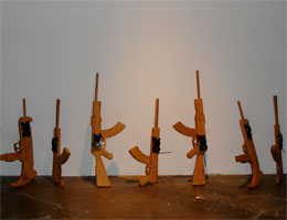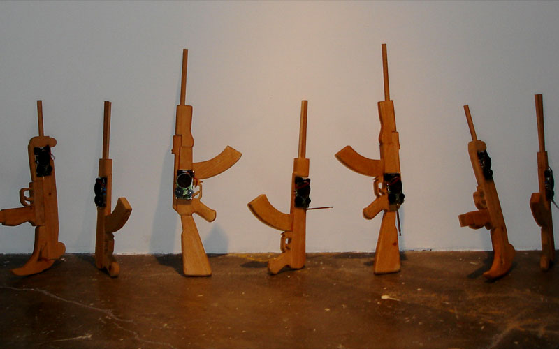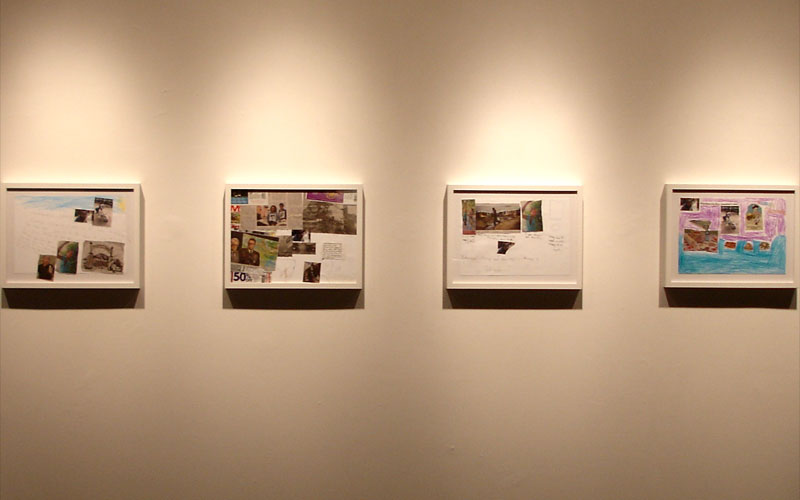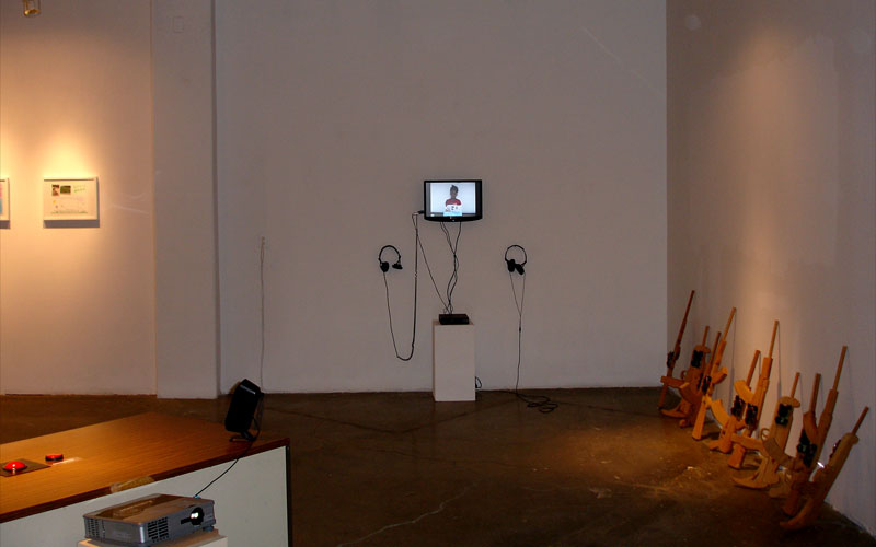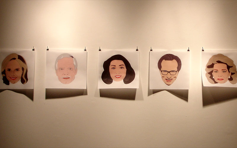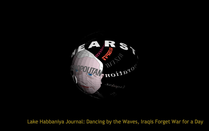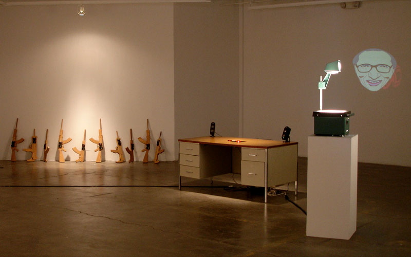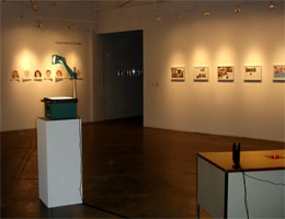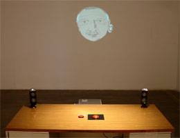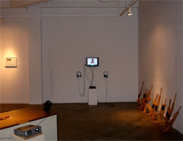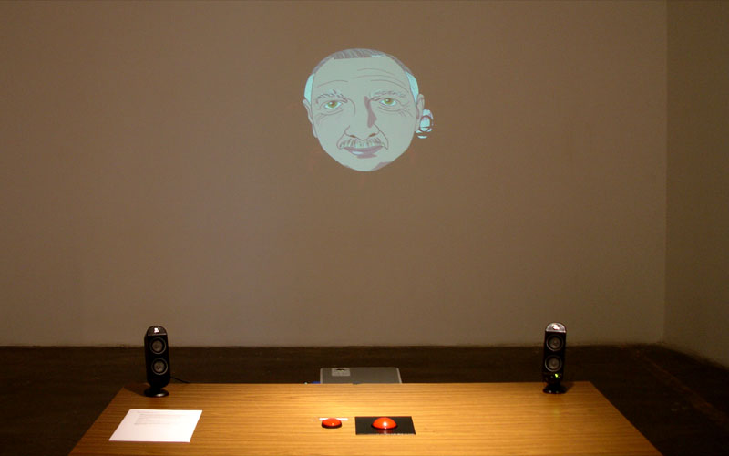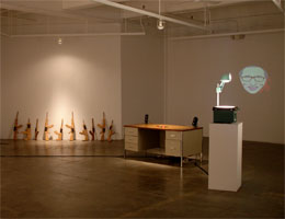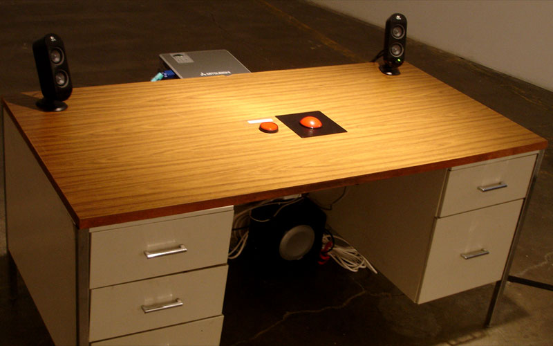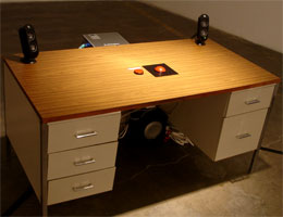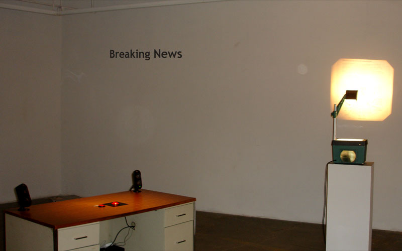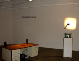 The primary component of the installation is the Breaking News application that is built with Processing. The applicaiton is projected onto a wall and controlled via a trackball and push button that are embedded into an office work desk. The application displays a series of 2D illustrations of famous news-related personalities wrapped onto a 3D sphere. Behind the portrait is hidden the logo of the broadcast company that the individual is most closely identified with; the trackball allows users to turn the 3D sphere. When the user pushes the button adjacent to the track ball the virtual sphere spins and stops with a randomly selected portrait and logo or with an iconic news photograph. Famous news photographs are interspersed with the news personalities. Below the 3D sphere are real time news feeds from a variety of online sources. The application uses the Minim audio library, Bruno Nadeau's romeFeeder library, and the opengl library. Thank you Ben Fry, Casey Reas and the Processing community.