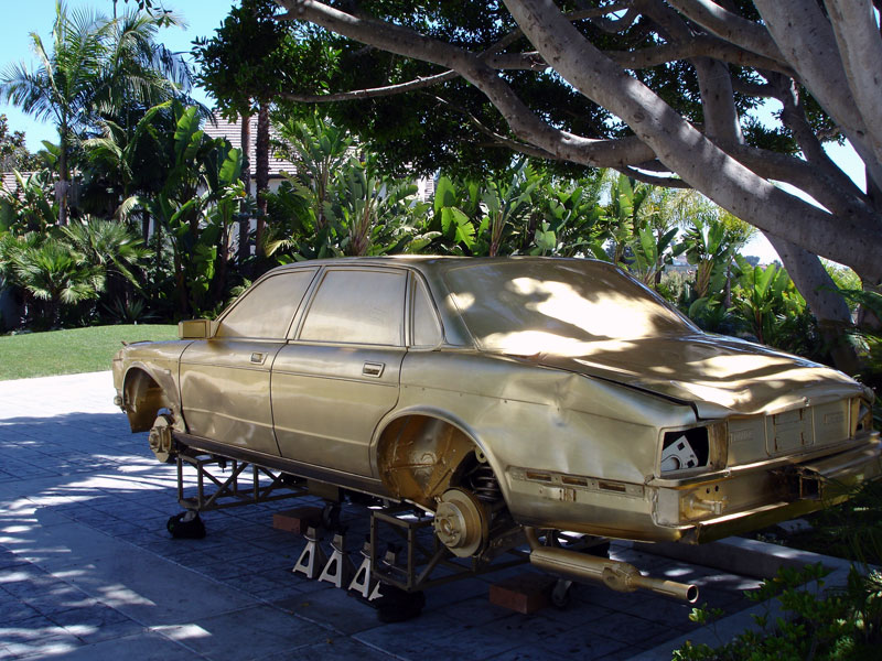 "an inverted trajectory of the recycling dynamic that characterizes the border zone. His project begins with the selection of a European car recovered from a junkyard in Tijuana and transformed into a 'jewel' through the addition of a skin of gold leaf. Once this trash object is transformed into a opulent golden sculpture it will be exhibited and auctioned in San Diego. Proceeds from the sale will be given to an elementary school in Tijuana and used to support visual art workshops for children, where students will be encouraged to add further layers of imagery to the paper money." |