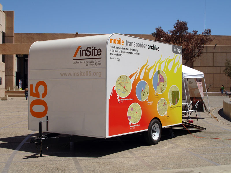 "The Mobile_Transborder Archive operates as a mobile unit moving between organizations, institutions, archives, university and public libraries in San Diego and Tijuana. The intention is to draw connections between individual researchers and activists, cultural and community centers and grassroots initiatives that focus on specific border issues in San Diego-Tijuana and the California-Baja California region, employing a transdisciplinary approach. Texts, books, photographs, films, videos, oral histories and online resources, addressing both, the specific region and archives as such, will be accessible in the transborder mobile."