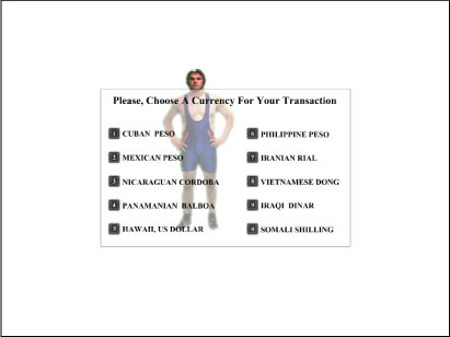 Once the viewer presses enter, the wrestler, pauses pacing and takes a few steps back. In front of him appears a semi transparent screen that asks the user to select a currency for her/his transaction. Ten countries with their currencies are presented. | |||||||||||||||